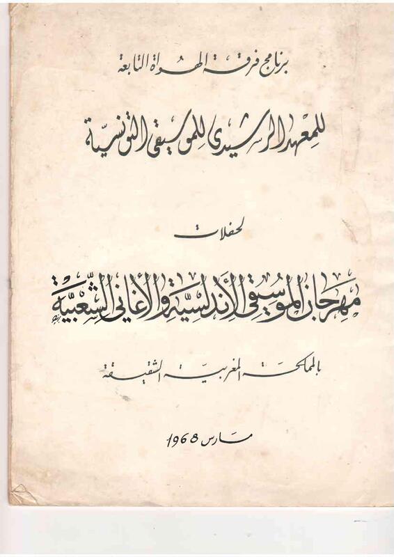 Boletín oficial emitido por el Ministerio encargado de la Cultura con motivo del festival organizado en Marruecos en 1968. La preparación del contenido del boletín fue supervisada por el Sr. Salah El Mahdi, responsable de la música y el arte popular. Incluye estrofas y canciones zajal del patrimonio tunecino, presentadas durante el festival por una orquesta de aficionados perteneciente a la Asociación Instituto Rashidi.