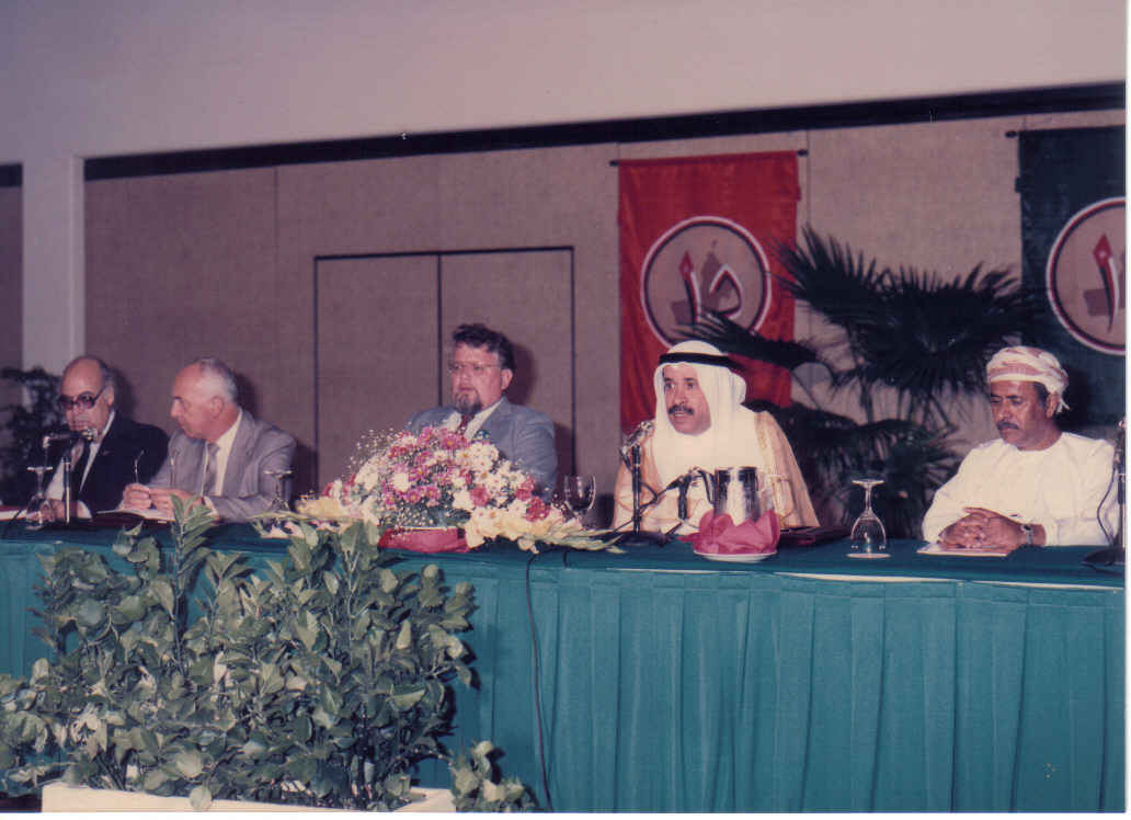 يرى عن يمين الأستاذ صالح المهدي: الأستاذ يوسف شوقي (خبير من مصر أشرف على تنظيم المؤتمر)/ الأمين العام للمنظمة/ مندوب من البحرين / مسؤول في وزارة عومان
