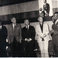 متوسطهم الأستاذ صالح المهدي و على يمينه مندوب من أمريكا و على يساره الأمين العام للمنظة