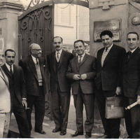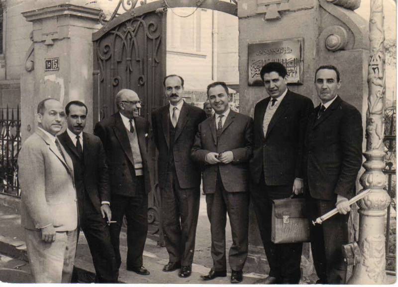 من اليمين إلى اليسار الأستاذ أحمد سري (مندوب الجزائر) / الأستاذ كامل القدسي (مندوب سوريا) / الأستاذ صالح المهدي / مدير المعهد / الدكتور محمود أحمد الحفني (أستاذ علوم موسيقية شهير و كان الأمين العام للمؤتمر الأول للموسيقى العربية بالقاهرة) / الأستاذ أحمد باخر (مندوب الكويت) / الأستاذ مرديني (موظف الجامعة العربية)