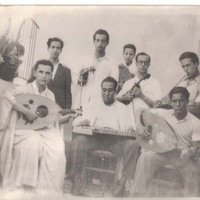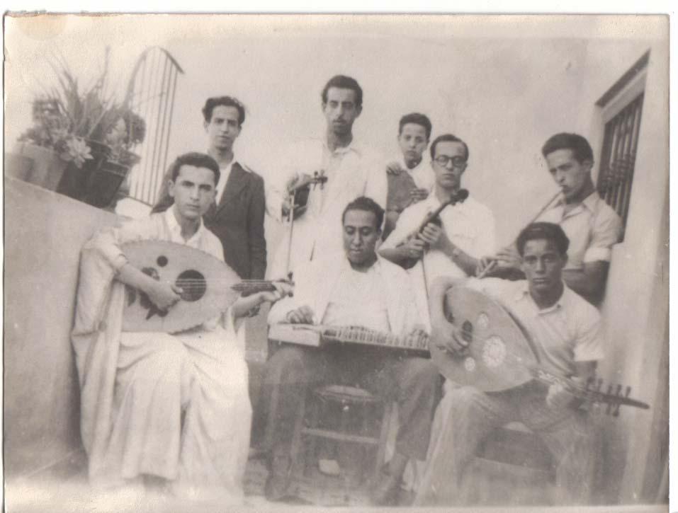 Professor Salah El Mahdi in the front row, beside him Hassan El Gharbi, and next to him one of the professor's most prominent students (owner of a shop in the Central Market). Directly behind Professor Salah El Mahdi is Professor Tahar Guiga, followed by Abdelhamid Slaïti (the tall one), the child Mongi Hassasna (cousin of Professor Salah El Mahdi), then on the violin Dr. Belhassen Farza (?), and next to him on the flute (Nay), one of the students
