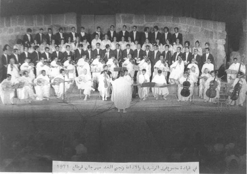 Un conjunto formado por tres agrupaciones musicales: Al-Rachidia, la troupe Najm El Ghad (Estrellas del Mañana) y la troupe de Artes Populares — aproximadamente 120 miembros entre músicos y cantores.
