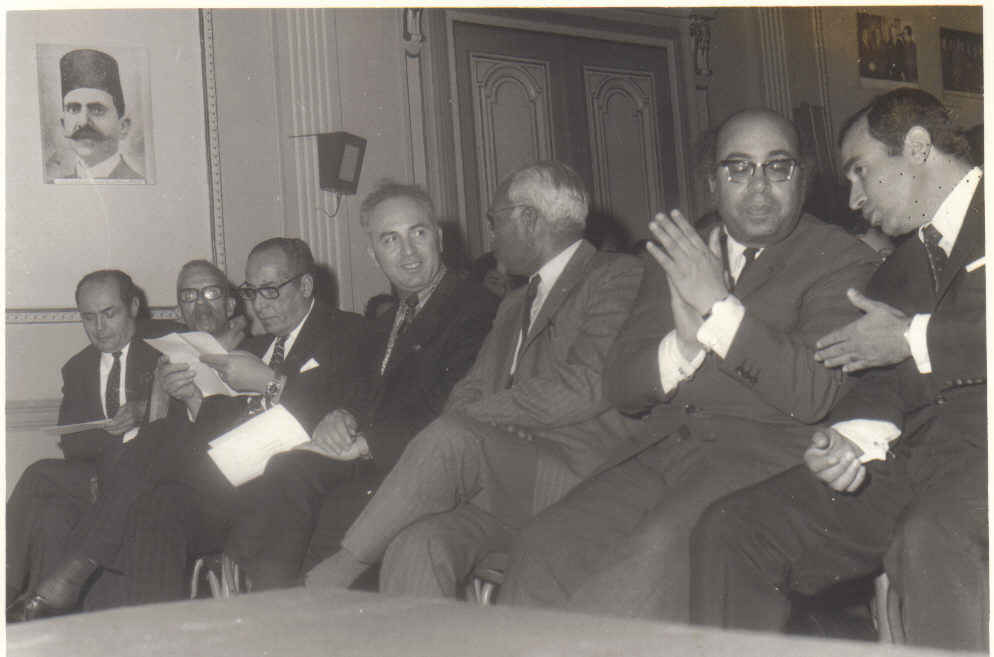 الأول السيد طيب الدريدي ( رئيس ديوان وزير التربية ) و الثاني محمد المرزوقي و يليه صالح جودت و يليه السيد صالح الهمدي و يليه السيد عبد الحميد الجزيري ( أمين مال الرشيدية ) و الدكتور يوسف شوقي و المندوب الثقافي المصري